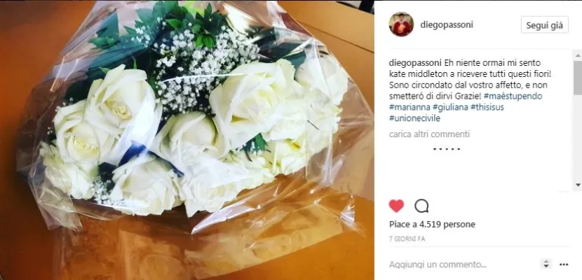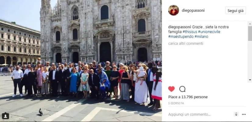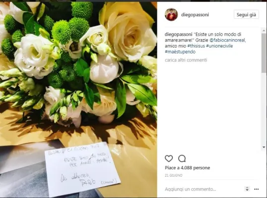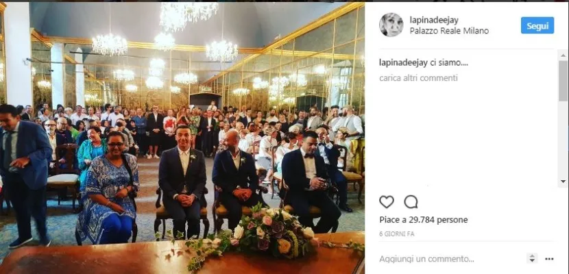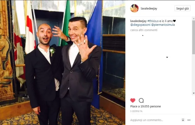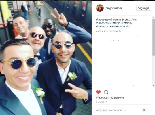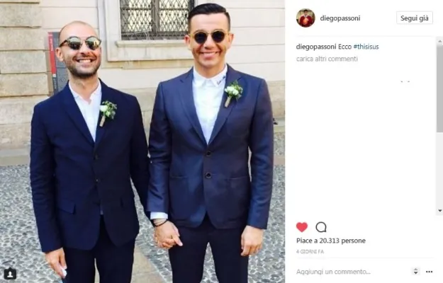 "Voglio dire davanti alle nostre persone care: 'Signori, io mi voglio prendere cura di lui per tutta la vita'". Con queste parole Diego Passoni, il famoso conduttore di Pinocchio di Radio Deejay, si è unito civilmente col compagno Pier Mario Simula. Come racconta "Donna moderna", i due, insieme da quasi 10 anni, hanno presenziato alla cerimonia a Milano a Palazzo Reale e sui social hanno condiviso le foto dei festeggiamenti. La scelta della data non è stata casuale: il 24 giugno, in coincidenza con il Gay Pride. "Lo abbiamo fatto per noi e per commemorare tutti coloro che hanno combattuto perché oggi noi avessimo dei diritti", hanno raccontato. Si è trattato di una festa lunghissima cominciata al mattino, continuata poi con un pranzo intimo tra famiglia e testimoni, e finita la sera con un divertentissimo party nel locale Al Fresco di Milano.