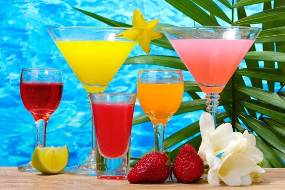 Per la sera consigliati, invece, lo Swimming Pool a base di Blue Curaçao – liquore con scorza di lahara, arancia dal sapore amaro, alcool, zucchero, acqua –, sciroppo di cocco, succo d’ananas, panna fresca; il Mojito con rhum bianco, angostura – estratto amaro di vegetali –, foglie di menta, zucchero di canna, lime, soda, ghiaccio; il Tropical, con latte – anche di soia o di mandorla –, sciroppo d’orzata, sciroppo di menta; il Caipirinha con lime, zucchero di canna, ghiaccio tritato; il Daiquiri con succo di limone o lime, ghiaccio, rhum secco, sciroppo di zucchero; il Margarita con succo di lime, fettina di lime e sale da strofinare sul bordo, Tequila, Triple sec.
