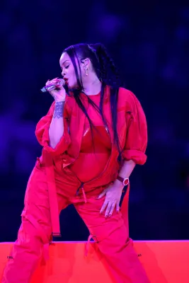 Rihanna ha invaso il Super Bowl con una performance esplosiva fasciata da una tuta rosso su rosso di Loewe con piumino di Alaïa e guanti Pieter Mulier. La superstar ha cantato in 13 minuti un mix delle sue hit (Diamonds, Umbrella, Rude boy, Only Girl In the World, We found love, Work, Bitch Better Have My Money, ma anche All of the Lights di Kanye West e Wild Thoughts di DJ Khaled). Di grande effetto la scenografia, con un palco mobile che saliva e scendeva come quelli dell'esercito di ballerini che la circondava, tutti in bianco e incappucciati con occhiali da sole scuri. Per lei applausi e ovazioni tra fuochi d'artificio, per un evento - in assoluto il più seguito nel Paese - che ha tenuto incollato alla tv oltre 100 milioni di americani, tra vip, spot milionari con personaggi dello sport e dello spettacolo, e scommesse sportive da capogiro.