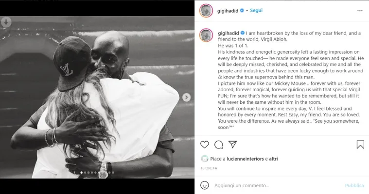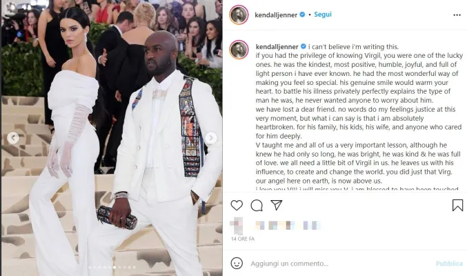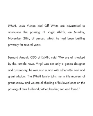 'Il gruppo LVMH, la Maison Louis Vuitton e Off-White hanno l'immenso dolore di annunciare la scomparsa di Virgil Abloh, colpito questa domenica 28 novembre da un cancro che ha combattuto per diversi anni', ha dichiarato LVMH sul suo account Twitter. La malattia di Virgil Abloh non era stata resa pubblica.