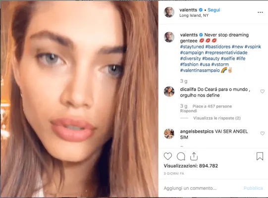 “Non smettere mai di sognare”. Così scrive Valentina Sampaio accanto a un video che ne riprende il volto incantevole e perfetto. Gli hashtag di rito chiariscono che il sogno di cui parla la bellissima modella brasiliana ha il nome di Victoria’s Secret, ovvero della marca di lingerie più famosa del mondo che per la prima volta affiderà l’immagine iper-femminile e sensuale dei suoi capi di seduzione a una modella transgender. Valentina infatti sarà uno dei nuovi 'Angeli' a sfilare con la lingerie più desiderata dalle donne.