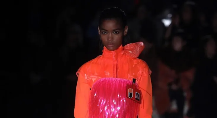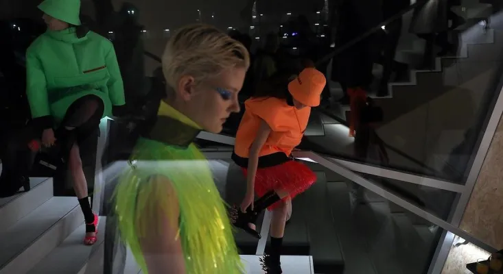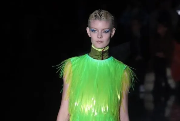 I colori fluo sono tendenza moda sia quando colorano i pantaloncini ciclista o le tute sportive, sia quando accendono capi più bon ton, come la gonna plissé di Prada con giubbotto arancione evidenziatore, o il vestitino verde pennarello con frange di plastica, oppure la giacchetta stilosa di Gucci.