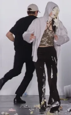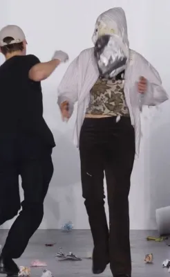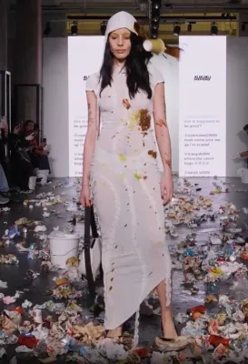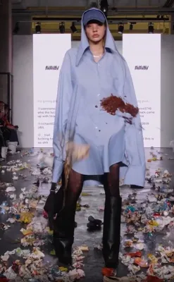 Agli ospiti sono stati infatti distribuiti guanti in lattice e contenitori pieni d’immondizia con l’invito a lanciarli contro le modelle e i modelli in passerella. C’era d’aspettarsi che in tanti non raccogliessero il suggerimento e invece, il pubblico si è scatenato in un liberatorio tripudio di lanci di rifiuti di ogni genere colpendo le indossatrici sul corpo e sul viso.
