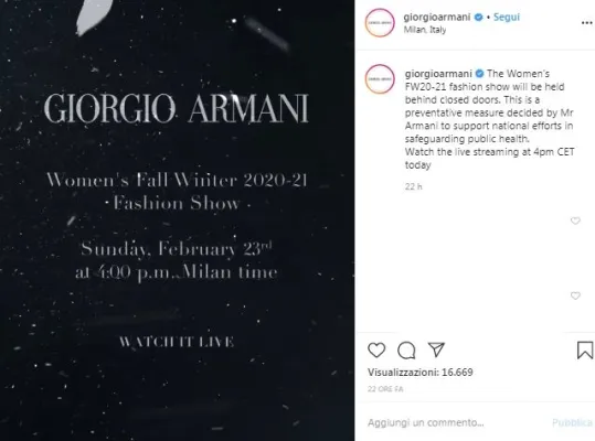 Non solo sfilata a porte chiuse, Giorgio Armani ha deciso di chiudere per una settimana gli uffici di Milano e le sedi produttive che si trovano in Lombardia, Emilia Romagna, Veneto, Trentino e Piemonte.