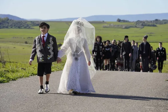 Sulla strada verso il sito, che fa da passerella, tutte le passioni e gli stilemi di Marras: i tessuti stampati, vellutati, jacquardati e materici, le rose, gli scozzesi, i colori forti come il nero e il rosso, il giallo e il verde, ma anche le paillettes, i tulle, le piume, i ricami e gli strass sparsi in abiti iperfemminili dallo stile volutamente un po' retrò ma non nostalgico, fatto di volumi strizzati in vita, ma poi ampi e svolazzanti. Per lui, invece, completi in gessato o in patchwork ricamato e felpe con scritte in sardo. Tutti insieme, uomini e donne, in un corteo aperto da due bambini, camminano verso questo luogo sacro a chiedere l'intercessione alla dea del luogo per la fine della pandemia. Al tramonto la liberazione, con un ballo collettivo su musica dal vivo di un artista sardo.