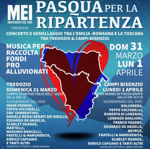 La manifestazione, a cura del MEI – Meeting delle Etichette Indipendenti di Faenza, gode del patrocinio della Regione Emilia – Romagna e della Regione Toscana, dei Comuni di Tredozio e Campi Bisenzio, della Pro Loco di Tredozio e del Teatrodante Carlo Monni di Campi Bisenzio e intende tenere alta l’attenzione sui territori colpiti dall’alluvione rafforzando, anche attraverso un “gemellaggio musicale” la solidarietà tra le popolazioni, romagnole e toscane, colpite.