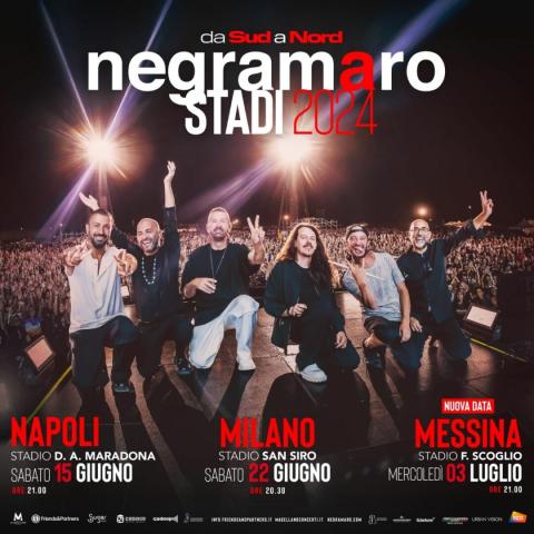 MILANO (ITALPRESS) – Si aggiunge una nuova tappa al viaggio andate e ritorno, da Sud a Nord, che i Negramaro faranno quest’estate negli stadi italiani: non poteva, infatti, mancare la Sicilia a cui la band è da sempre legatissima. L’appuntamento sarà allo Stadio Franco Scoglio (San Filippo) di Messina il prossimo 3 luglio. Dopo due decenni di successi e trionfi musicali, i Negramaro sono pronti a scrivere un altro capitolo della loro storia, con nuovi imperdibili eventi live negli stadi nel 2024 che uniscono virtualmente il Sud e il Nord d’Italia. Tre stadi iconici: il 15 giugno allo Stadio Diego Armando Maradona di Napoli (inizio show ore 21:00), il 22 giugno allo Stadio San Siro di Milano (inizio show ore: 20:30) e il 3 luglio allo Stadio Franco Scoglio (San Filippo) di Messina. I biglietti per la nuova data, organizzata e prodotta da Friends&Partners e Magellano Concerti, saranno disponibili su TicketOne in presale per il fanclub dalle ore 11:00 di mercoledì 22 novembre. E per tutti da giovedì 23 novembre dalle ore 11:00 sempre su TicketOne.