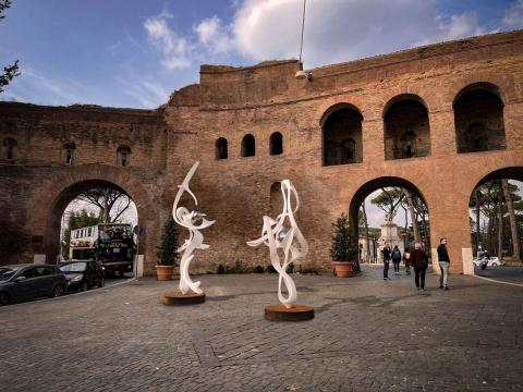 Il Mito dei Dioscuri presentato in un contesto contemporaneo è sottolineato dalla coppia di sculture poste a Porta Pinciana, che richiama le due divinità: Il Volo (alta 5 metri) e L’Attimo Fuggente (4 metri) sono due opere verticali che dialogano tra di loro, rappresentando idealmente Polluce e Castore. Il Volo rappresenta idealmente Polluce il fratello divino, nella consapevolezza che l’uomo non possa accontentarsi della sola materialità, ma possa “volare alto” per sentirsi vivo, per crescere, anche grazie alle difficoltà. L’Attimo Fuggente simboleggia Castore, il fratello mortale, e ci ricorda che la vita va vissuta appieno, poiché è un attimo e ciò che è perduto non ritorna. Questa scultura con un accenno di afflosciamento rappresenta Castore, colto nell’attimo del passaggio tra la vita e la morte. Nella scena, Il Volo-Polluce allunga dolcemente una sfera di immortalità e consapevolezza da condividere con il fratello mortale L’Attimo Fuggente-Castore. Nel mito greco, quando il fratello mortale Castore fu ucciso dagli Afaridi, Polluce pregò Zeus che gli concesse di rinunciare a metà della propria immortalità in favore del fratello. Così i due vissero insieme alternativamente un giorno nell’Olimpo e un giorno nel regno dei morti.