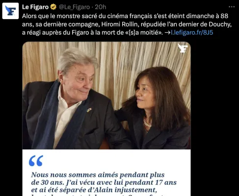 "Sono devastata", ha detto Rollin a 'Le Figaro'. "Ci siamo amati per oltre 30 anni e per 17 abbiamo vissuto assieme. Sono stata allontanata da lui ingiustamente e con violenza". La donna ha poi svelato: "Lo scorso marzo mi aveva mandato un messaggio chiedendomi di andarlo a trovare perché si sentiva solo". I due si sono conosciuti nel lontano 1992 sul set del film 'Il ritorno di Casanova'. Lei era assistente alla produzione. Tra Hiromi e Alain è scattata subito la scintilla, nonostante l'attore avesse una relazione con Rosalie Van Breemen, madre di Anouchka e Alain-Fabien Delon. Anthony Delon, invece, è nato dalla relazione del divo con Nathalie Delon, morta nel 2021. Qualche tempo dopo, Hiromi si trasferì a casa di Delon, raccontando in un'intervista di qualche anno fa, che per i primi tempi "quando arrivavano i suoi figli me ne andavo io. Poi le cose sono cambiate e anche loro hanno visto che dormivamo assieme, che ci baciavamo".