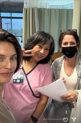 Accanto a lei c'è la figlia Matilde Lucidi, che posta un messaggio di incoraggiamento. Nell'immagine si vede la modella sul letto, con accanto cestini e vassoi con medicinali e trattamenti. "Vai mamma!" scrive la 16enne.