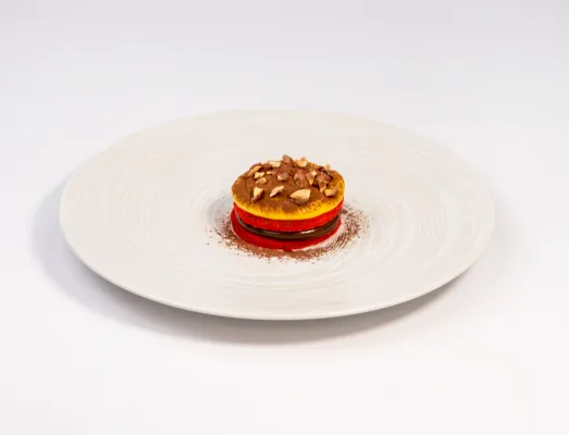 Formare un disco di acetato (diametro 7 cm e altezza 4 cm). Inserire un disco di pan di Spagna, bagnare con la bagna all'alchermes, dosare la crema pasticcera al cioccolato. Posizionare un altro disco di pan di Spagna, bagnare con altra bagna, dosare la crema pasticcera, decorare con granella di mandorle pralinate e spolverare leggermente di cacao.