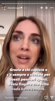 Ma non finisce qui. "E' un periodo veramente doloroso privatamente. Cerco di non parlarne più di tanto ma è pesante". L'imprenditrice digitale ovviamente si riferisce sia alle vicende giudiziarie legate alle attività di beneficenza, sia alla crisi coniugale, con la separazione da Fedez. "Capitemi se ogni tanto pubblico meno e se sono nei miei pensieri. Faccio quello che posso, a volte sono più in up e a volte sono più in down. Penso sia giusto farvi vedere questa parte: non posso dirvi tutto, non posso raccontarvi tutto. Non mi va nemmeno di dire tutti i motivi per cui sto male. Penso sia giusto non fingere che tutto vada bene e che io sia felice come una Pasqua e forte. A volte vorrei essere meno forte e solo un po' più serena". Poi racconta quanto siano importanti Leone e Vittoria: "In questi momenti essere genitore ti salva un po' la vita", e racconta il viaggio di lavoro a New York dove è stata impegnata in una serie di meeting "per un progetto nuovo, nuovissimo per me. Una cosa che non ho mai fatto prima. I meeting sono andati molto bene, tra qualche mese se andrà tutto bene lo dirò in maniera ufficiale. In tutta questa merda di questo periodo spero ci siano anche cose belle e nuove per darmi nuovi stimoli".