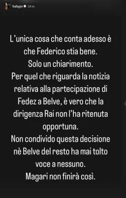 Del resto su Instagram la giornalista aveva preso le distanze da questa imposizione, confermandola senza diplomazie. "L'unica cosa che conta adesso è che Federico stia bene. Solo un chiarimento per quel che riguarda la notizia relativa alla partecipazione di Fedez a Belve: è vero che la dirigenza Rai non l'ha ritenuta opportuna. Non condivido questa decisione nè Belve del resto ha mai tolto voce a nessuno. Magari non finirà così", ha scritto sperando in un happy end nelle prossime puntate ma che, a quanto risulta al momento, non è contemplato.