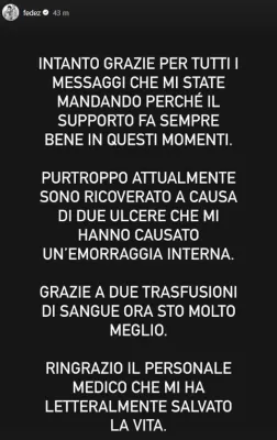 Fedez sta male, ormai lo sappiamo tutti. Da quando Chiara Ferragni è scappata via dal Parigi presa per mano con l'amica Chiara Biasi per volare a casa dal marito. L'artista è ricoverato da giovedì al Fatebenefratelli di Milano dopo l'emorragia interna causata da due ulcere intestinali. Fan, familiare e medici si sono tutti molto allarmati visto il precedente tumore raro al pancreas di cui è stato operato nel marzo 2022. In ospedale il cantante ci resterà ancora per giorni per le cure del caso a cominciare dalle trasfusioni che come lui stesso ha detto "mi hanno salvato la vita".