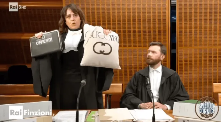 La scena si svolge in un’aula di giustizia dove Cucciari è la giudice, Vanessa Scalera il pm e Massimiliano Gallo l’imputato, nonché marito della pm. Che cosa ha mai combinato lo sprovveduto consorte? Vanessa Scalera parte come una tagliola: “I fatti qui sono gravissimi. L’imputato è accusato di un reato tra i più odiosi. Oltre a non essersi accorto che sua moglie è andata dal parrucchiere, le ha regalato per il compleanno delle borse contraffatte spacciandole per vere”. Massimiliano Gallo prova a difendersi come può: “A parte il fatto che mi sono ricordato del compleanno, il che non è poco, questa storia del processo mi pare eccessiva. Potevamo parlarne a casa”. Cucciari è irremovibile: “Imputato non aggravi la sua situazione. Prego procuratore, continui”. E così Vanessa Scalera tira fuori delle borse farlocche con su scritto “Offendi”: “Quest’uomo si è presentato a casa tutto fiero con delle borse, vostro onore. Ma sono improponibili. Gliele mostro: questo qui è il corpo del reato”. Schifata Cucciari-giudice continua: “Ma lei si rende conto? Umiliare così la donna della sua vita”. Massimiliano Gallo insiste: “Ma sono falsi perfetti. E poi una borsa è una borsa: ci metti dentro le cose. Che differenza fa se è vera o falsa?”. “Imputato io le do una possibilità: se lei mi dice dove ha comprato queste borse la lascio andare: le ha comprate online? In un mercatino?”.