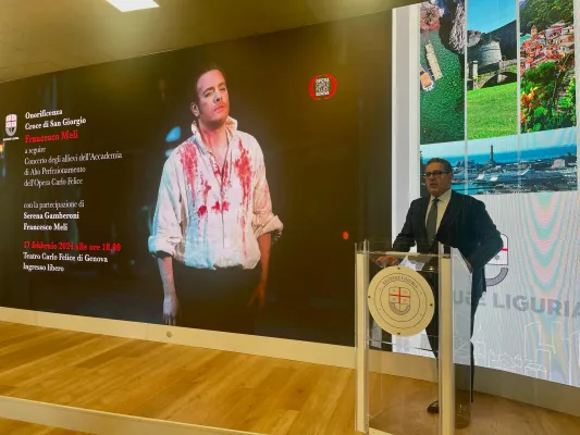 Quando Regione Liguria ha deciso di assegnare la Croce d’Oro di San Giorgio, la massima onorificenza regionale, al tenore Francesco Meli – un riconoscimento che per capirci finora era andato solo a Gino Paoli, Tullio Solenghi e Elisabetta Pozzi, la maggiore attrice teatrale italiana – il presidente della Regione Giovanni Toti e la coordinatrice delle Politiche Culturali Jessica Nicolini, sempre attentissimi alla grafica, hanno realizzato un invito con il volto del giovane tenore e hanno iniziato a divulgarlo.