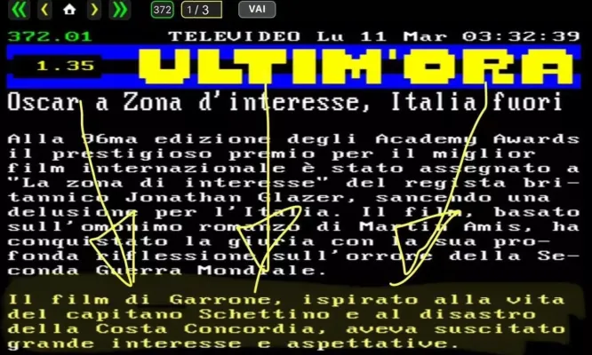In fatto di errori e goffaggini però noi italiani non vogliamo essere secondi a nessuno. Così il Televideo dando conto dell’Oscar al miglior film straniero per “La zona di interesse” e della conseguente delusione per Matteo Garrone e il suo “Io capitano” ha pensato bene di descriverne la trama come ispirata al capitano Schettino e alla tragedia della Costa Concordia (!). In realtà il film di Garrone parla del viaggio avventuroso di due giovani che lasciano Dakar per raggiungere l’Europa. La pagina incriminata è ovviamente sparita, ma non prima di diventare virale sui social.