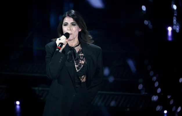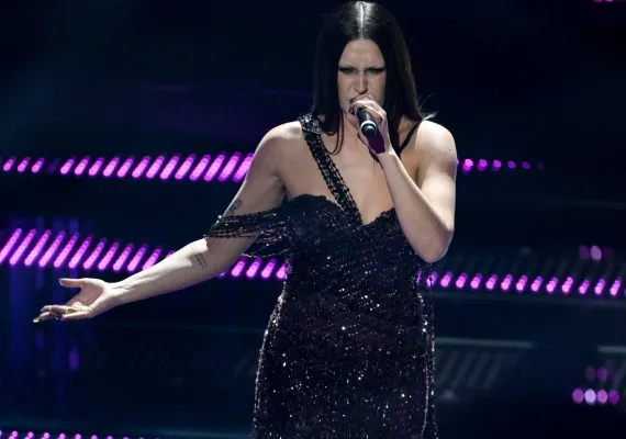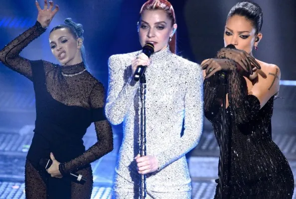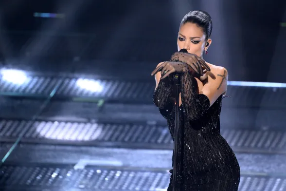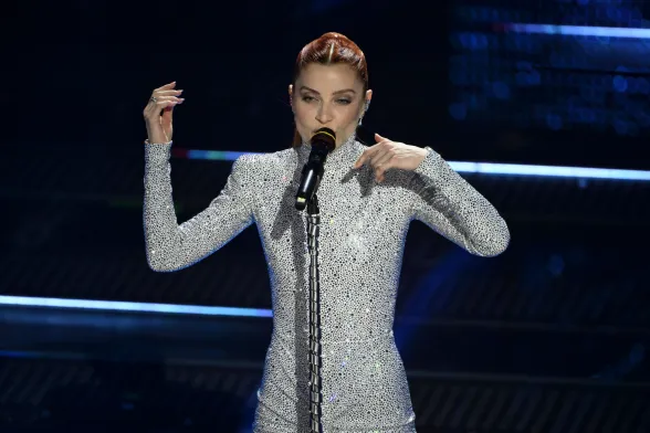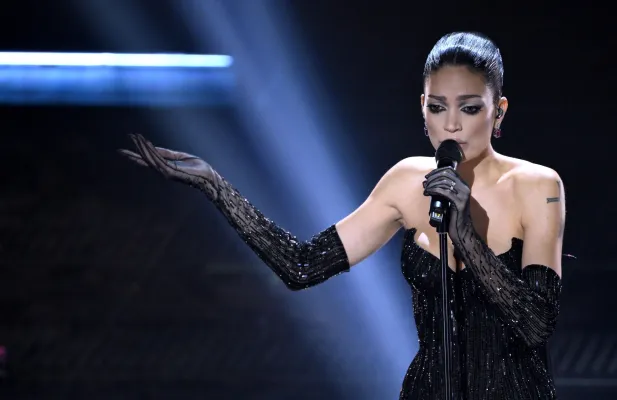 Una notte buia stellata su un abito elegantissimo che scopre le spalle, incornicia in modo estremamente sexy il seno e si lascia completare da guanti lunghi trasparenti con lo stesso gioco di punti luce dell’abito che impreziosiscono le braccia. Capelli raccolti che scoprono il viso e mettono in risalto uno degli sguardi più carismatici del nostro panorama musicale.