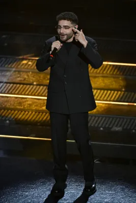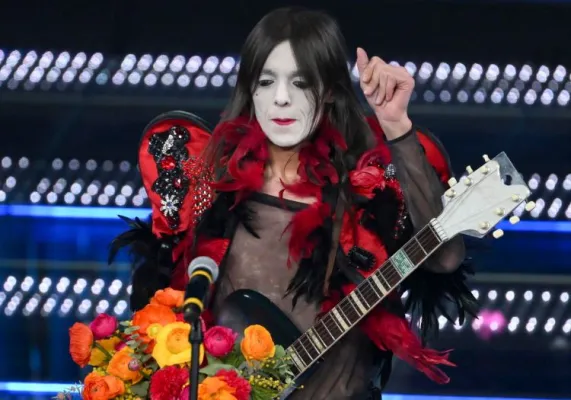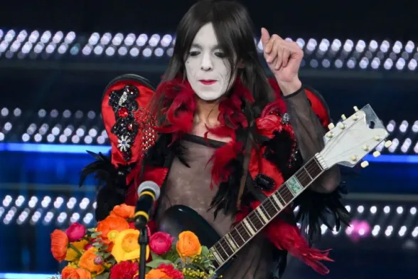 Gli unici reali e innovativi Maestri di Stile del Sanremo 2025. Il cappello rosso a falda larga, il pizzo, il collo rosso di papaveri su un abito maschile destrutturato con nappine ovunque.