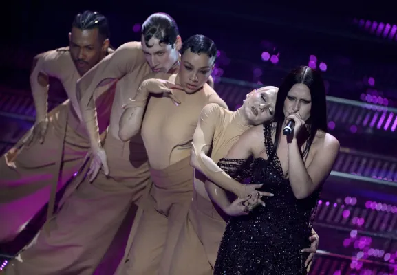 Una spolverata di pietre riflettenti on tone sulla spalla per non rinunciare al tipico tocco da festa! Sceglie la spersonalizzazione del total black per farci concentrare sul suo testo…peccato perchè forse era o’ juorno buono per osare di più!