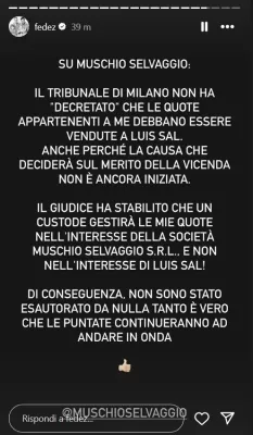 "Il provvedimento del tribunale di Milano non ha decretato ancora nulla sulla vicenda Muschio Selvaggio. In relazione alla recente dichiarazione dell'ufficio stampa di Luis Sal, apparsa su diversi siti di informazione, merita una correzione riguardo alla decisione del tribunale di Milano sulle quote della società di Fedez". Non si fa attendere la replica di Fedez sull'affaire Muschio Selvaggio. "Contrariamente a quanto affermato, il tribunale di Milano", si spiega in una nota stampa "non ha 'decretato' che le quote appartenenti a Doom debbano essere vendute alla società di Sal. L'ordinanza emessa è di natura cautelare e prevede la nomina di un custode per le quote della società Muschio Selvaggio s.r.l., di proprietà di Doom. È infatti importante sottolineare che la causa che deciderà sul merito della vicenda non è ancora iniziata". "Il giudice - si legge ancora - ha stabilito, sulla base di una valutazione ancora sommaria, propria della fase cautelare, che il custode gestirà le quote di Doom nell'interesse della società Muschio Selvaggio s.r.l., e non nell'interesse della società di Luis Sal, come richiesto dallo stesso nel suo ricorso. Di conseguenza, non c'è stata alcuna esautorazione di Fedez dalla gestione del podcast, a differenza di quanto dichiarato nella nota emessa stamattina".