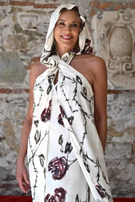 In Sicilia è sbarcata, grazie alla consulenza di Marco Fallanca, circondata da bodyguard, e dal fidato stylist, Paris Libby. L’occasione era il Cariddi d’Oro alla carriera, il massimo riconoscimento della manifestazine. L’incontro avviene poco prima di mezzogiorno, all’interno del prestigioso Hotel San Domenico, lei bellissima, fasciata da un bellissimo abito bianco, con rose e spine, firmato da Antonio Marras (alla sera indosserà Dolce&Gabbana), che rimanda a quello indossato da Kim Basinger in L.A. Confidential. “Buongiorno, grazie”, pronuncia in italiano.