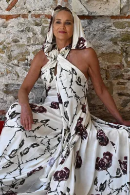 Fasciata in un bellissimo abito con rose e spine
