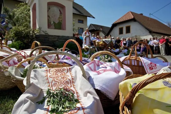In Carinzia, sabato è il giorno della benedizione degli ingredienti per il pranzo di Pasqua. I cibi vengono posti in un cesto, decorato con i primi fiori primaverili e coperto con delle tovagliette di lino ricamate con motivi sacri e le iniziali della donna che porta il cesto.