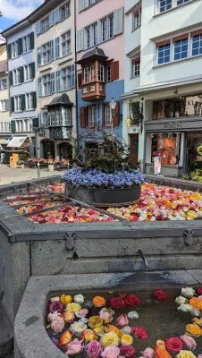 Zurigo… in rosa. Nel centro storico della città svizzera alcune fontane vengono decorate da migliaia di boccioli di rose donati dalle chiese, creando sino al 10 aprile un effetto cromatico spettacolare. L’iniziativa fa parte del progetto "Ohne Dornen keine Rosen" (niente rose senza spine). voluto dalle Chiese della Città Vecchia, il cui scopo è quello di diffondere un segnale di speranza proprio durante la Settimana Santa e la Pasqua.