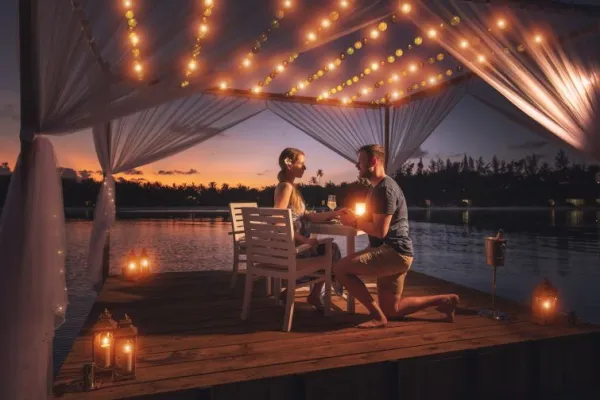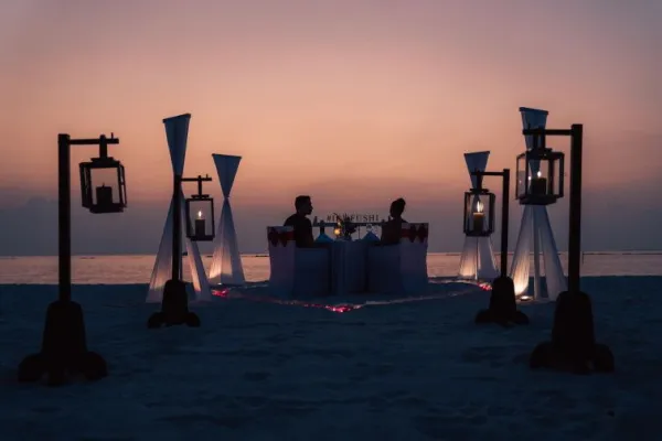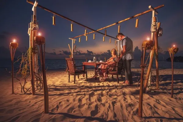 Disponibile solo al Sun Siyam Olhuveli c’è un'altra esperienza culinaria unica per chi cerca il romanticismo, una cena sulla piattaforma galleggiante sul mare, con una suggestiva vista notturna della spiaggia e con un delizioso menù per una serata intima con la persona amata.